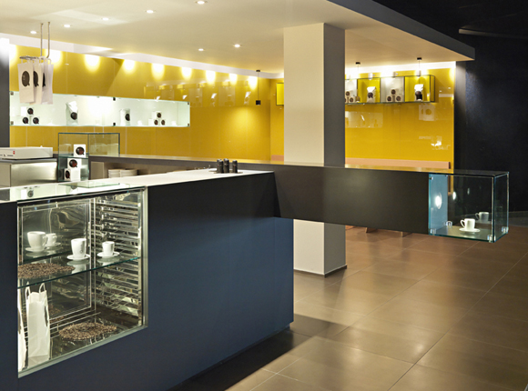 catalyst into the atrium of the multiplex, while a bench and a few chairs provides a more intimate alcove. In between there is the Kubo, a monolith-counter on wheels. Particular care was devoted to the presentation of the goods of the brand, following the Quality Boutique Caffè concept: an illuminated lantern, like a sugar cube terminates the suspended bar counter, while different color glass shelves are marking the glass cladded walls, and a shopper-rack over the cash desk is ready for those willing to buy the brand products........more